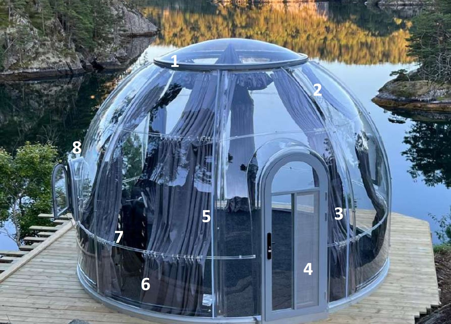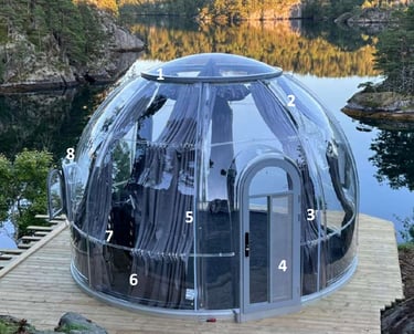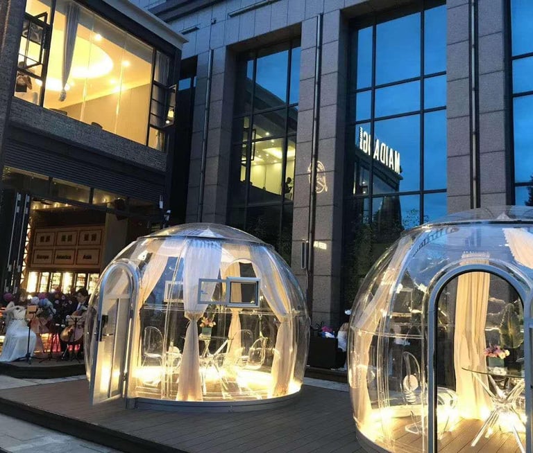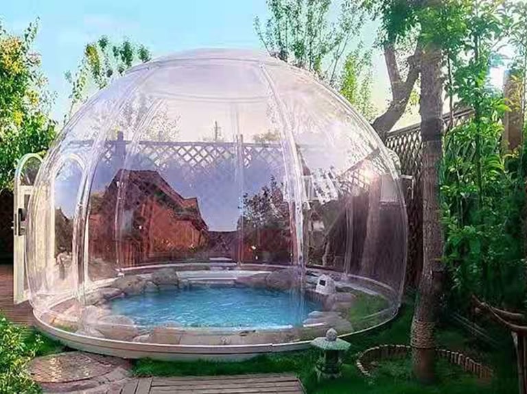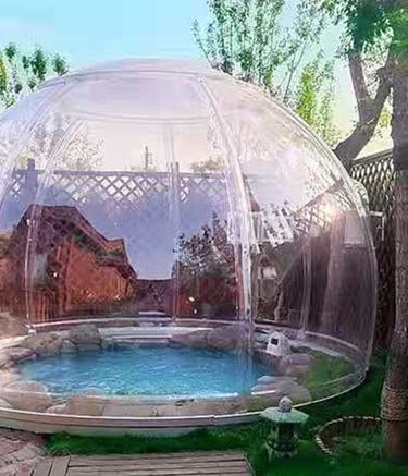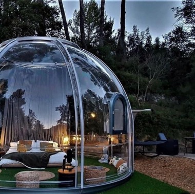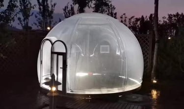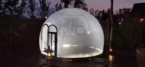 The main part of the transparent dome house is made of polycarbonate. Polycarbonate is a tough thermoplastic resin and has the title of "Plastic King". PC material has no toxic substances, has high heat resistance, good toughness and impact strength, high flame resistance, it has a wide range of applications in industry and construction, such as aircraft cabin covers, architectural special-shaped curtain walls, bulletproof glass, explosion-proof shields, etc.